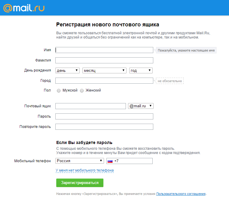 Заполняем все поля, желательно поле мобильный телефон в почте mail.ru тоже заполнить, так как если по каким либо обстоятельствам у Вас не будет возможности зайти на свой почтовый ящик, возможно вы забудете пароль или Ваш ящик взломают, то по номеру мобильного телефона Вы сможете с легкостью восстановиться его.